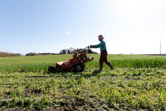 はなわ農園では暖かくなる四月中旬、麦の穂が出て背丈が60~70センチ以上になり、茎の中が管の状態になるまで麦を鋤き込みません。麦の穂にはたくさんのミネラルが含まれており、これが栄養となるのです。また、地温が十分に上がらないと(15度以上)鋤き込んだ麦を分解する微生物が十分に働らきません。
