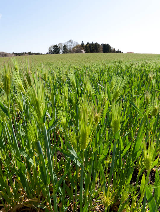 麦などの緑肥を土に混ぜ込むことを「鋤き込み」(すきこみ)といいます。三月になると、他の農家は、まだ麦の穂も出ていない20~30センチの麦を鋤き込でしまいます。 (写真右の畑)